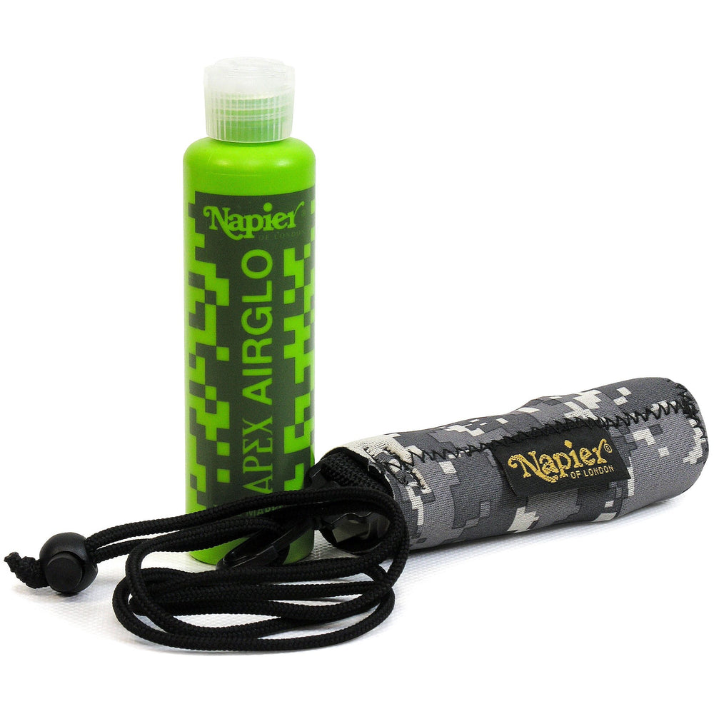 All hunters know how quickly a stalk can go horribly wrong if the wind changes direction part way through an approach, so successful stalkers use skill, and appropriate kit to maximise their performance. It is well known that Deer rely on their 3 senses to survive, and that some species have better eyesight than others, but what is common to all is that their primary defence is scent. The consensus from leading stalkers and pro hunters is that on average Deer rely on 65% Scent 15% Eyesight, 20% Hearing Over the years many attempts have been made to overcome this, deodorant sprays, pine flavoured chewing gum, scent treated garments etc. BUT the basic fact remains, a Hunter exhales 10,000 litres of HUMAN scent every day, & no amount of kit and skill will produce results if a deer catches your scent. Its game over and often you never even saw them! Some folks check wind occasionally, especially at the beginning of a stalk, with powders, cigarettes, or just observing the trees. Rarely is the ground level air moving in the same way as the tree tops, and it can change instantly as you walk, affected by hedges, terrain & turbulence, sufficient to wreck an approach. It is therefore important to check and re check often. Airglo was developed by Napier to be easy and convenient to use. First we looked at the alternatives and found that most use quite large particles & just pack in squat bottles, very difficult to grip and never easy to find in the pocket just when required. Pack Contains:1 Dispenser & 1 camo neoprene sleeve with belt clip and neck cord.